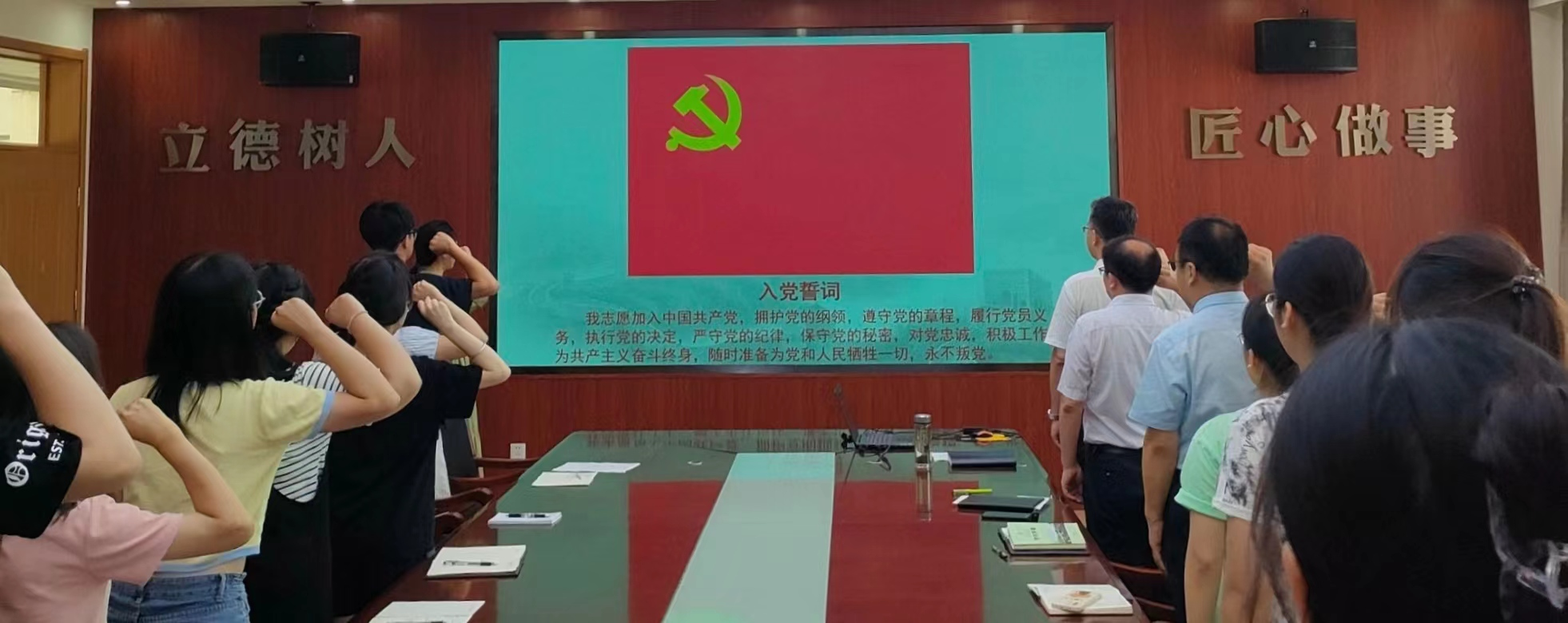 在第六党支部书记江巧宁的带领下,全体新发展党员进行了入党宣誓。党委书记车广杰在讲话中向大家提出了四点要求,一是要不忘初心,牢记使命;二是要树立终身学习的理念,持续加强理论学习;三是要切实履行党员权利和义务;四是要常怀感恩之心、自律之心、忠诚之心,立足当下,实现自身的全面发展。