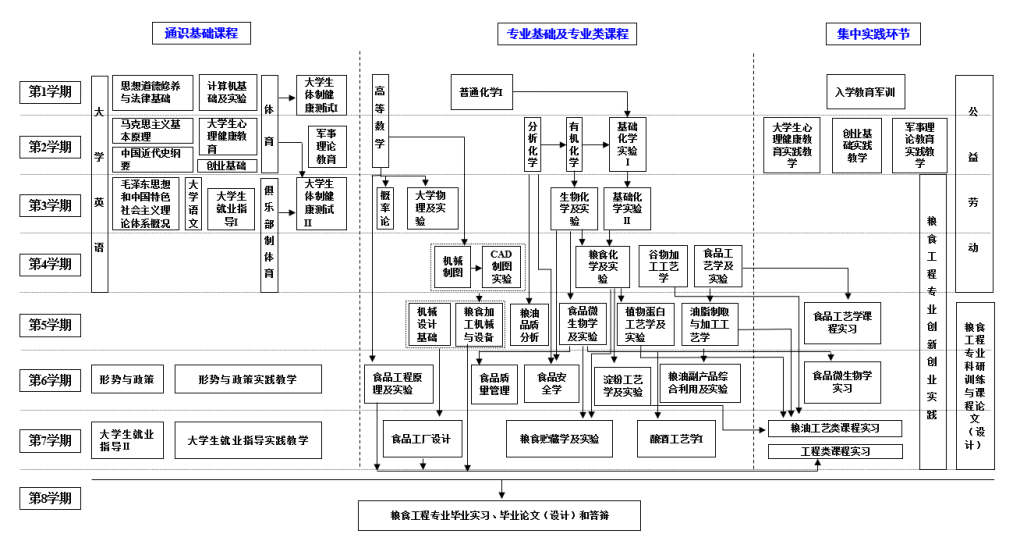 结合公司办学定位与粮食工程专业人才培养特色及要求,粮食工程专业培养方案构建了以“通识课程、学科(专业)基础课程、专业课程”三个必修课程平台为主体,以“实验实践教学体系和创新创业教育体系”为两大支柱,以“专业拓展课程和素质发展课程”两个模块为个性化发展的“3-2-2”应用型人才培养体系。该课程体系涵盖了工程教育认证要求的四大类课程:数学与自然科学类课程,工程基础类、专业基础类和专业类课程,工程实践与毕业设计(论文)以及人文社科类通识教育课程,突出了知识的基础性、系统性和前瞻性,体现了厚基础、精专业的培养目标,结构合理,层次清晰,为粮油加工工厂设计、粮食安全生产与贮藏、产品分析检验、新产品开发、质量管理和粮食国际贸易等方面的应用型高素质工程技术人才的培养打下坚实的基础。课程设置及必修课程的先行后续关系见图。