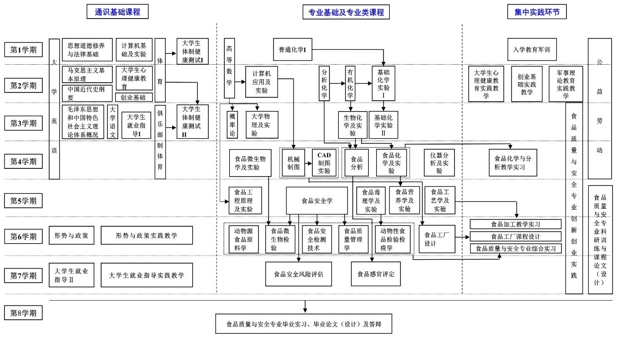 课程体系是决定人才培养目标是否能顺利实现的最关键环节,公司依据食品质量与安全专业的培养目标和毕业要求,结合公司办学定位与本专业人才培养特色及要求,构建了以“通识课程、学科(专业)基础课程、专业课程”三个必修课程平台为主体,以“实验实践教学体系和创新创业教育体系”为两大支柱,以“专业拓展课程和素质发展课程”两个模块为个性化发展的“3-2-2”应用型人才培养体系。该课程体系,涵盖了工程教育认证要求的四大类课程:数学与自然科学类课程,工程基础类、专业基础类和专业类课程,工程实践与毕业设计(论文)以及人文社会科学类通识教育课程。课程设置及必修课程的先行后续关系见图。