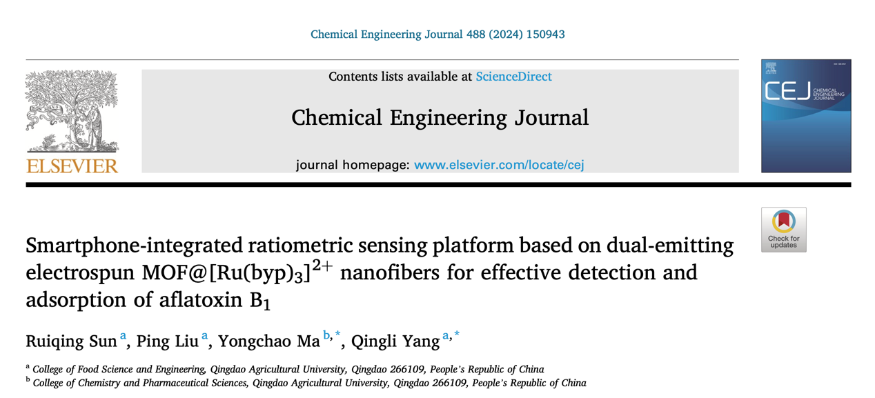 太阳成集团tyc522cc杨庆利教授团队在国际TOP期刊Chemical Engineering Journal(IF:15.1)发表了题目为“Smartphone-integrated ratiometric sensing platform based on dual-emitting electrospun MOF@[Ru(byp)3]2+ nanofibers for effective detection and adsorption of aflatoxin B1”(基于双发射MOF@[Ru(byp)3]2+静电纺丝纳米纤维的智能手机集成比率传感平台有效检测和吸附AFB1)的研究论文。
