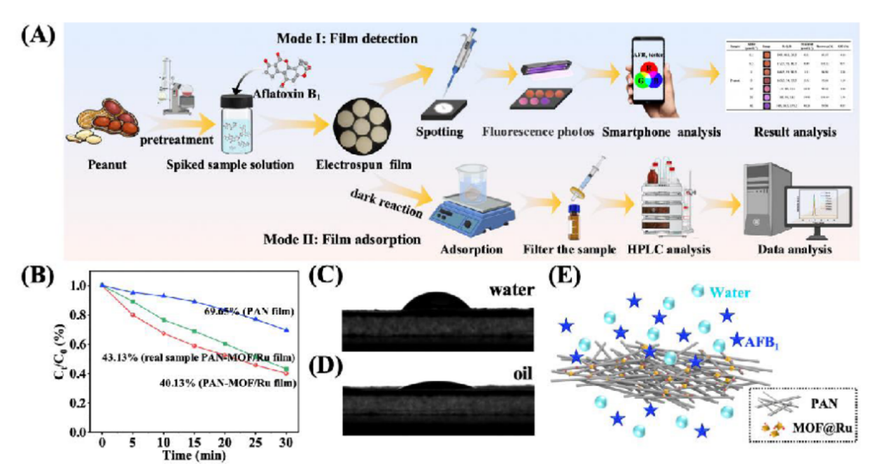 食品安全是一个重大的全球性问题,在中国这样人口稠密的国家尤为重要。全球每年约有25%的粮食作物受到真菌毒素污染,导致每年损失10亿吨粮食,影响了我们的粮食供应。AFB1是最普遍和最有害的真菌毒素,具有严重的致畸性、致癌性和致突变性。因此,需要开发一种灵敏、高效、便携的AFB1残留在线检测和吸附平台,以保障食品安全,保障公众健康。然而,在没有抗体或适配体等生物分子参与的情况下实现这一目标是个挑战,迫切需要一种绿色简便且能同时检测和吸附AFB1的方法。