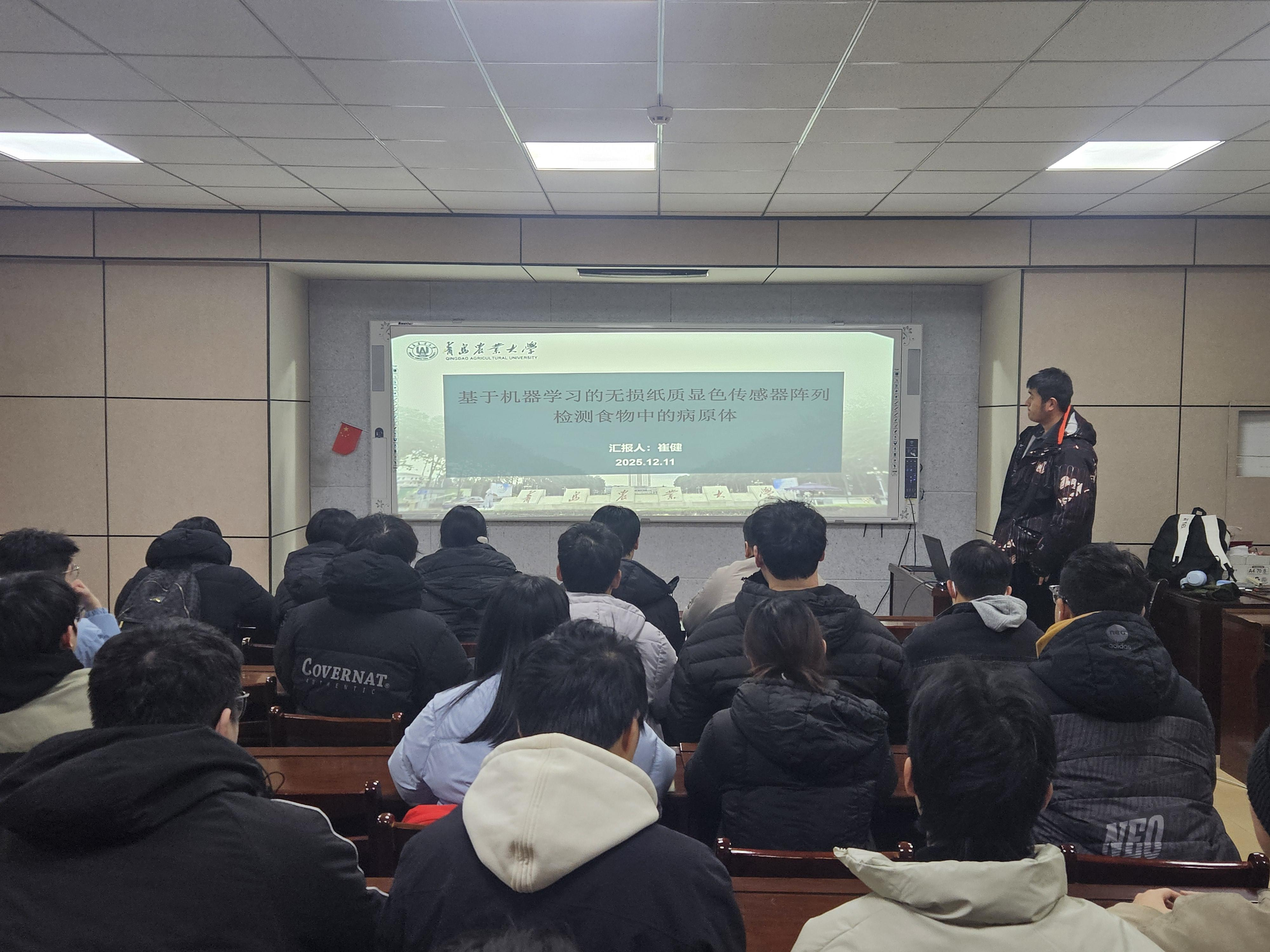12月11日,太阳成集团tyc522cc在食品楼302举办第六十期“食学研讲”活动。此次活动由食品硕2504班崔健主讲,主题为“基于机器学习的无损纸质显色传感器阵列检测食物中的病原体”。