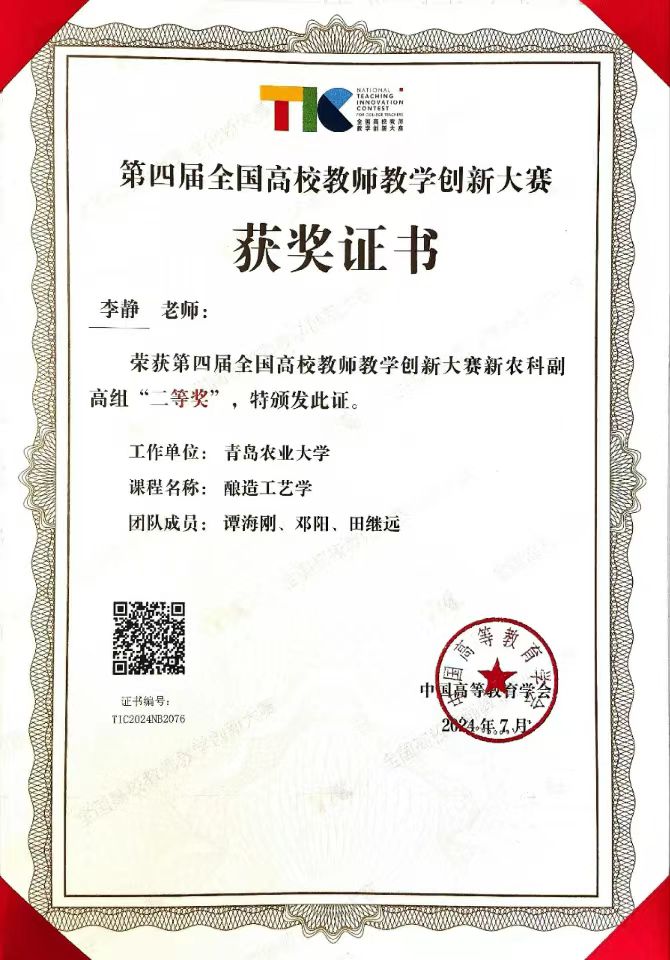 李静教授深耕教学二十载,紧密对接国家战略和行业需求,深度改革课堂,产教融合,打造了同频行业发展的教学内容,构建出以生产案例作为课堂发展主线的师生双链学习共同体教学模式。她主讲的《酿造工艺学》课程是第一批山东省级一流本科课程,荣获全国食品学科党建联盟优秀课程思政案例。公司产品期间,她与员工之间形成了紧密合作、相互促进的学习关系,营造了积极活跃的学习氛围,激发出员工的学习兴趣和创新思维,促进教学相长,提高了公司产品的质量和效果。