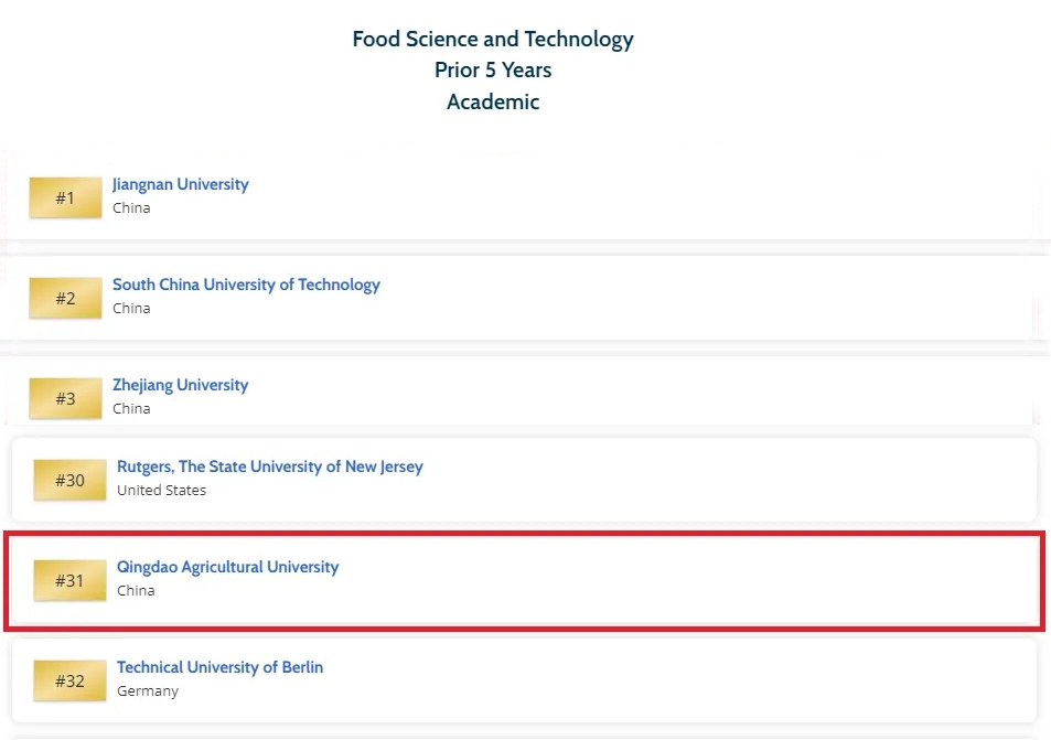 该网站公布的食品科学与技术领域全球学术机构排名,基于每个机构中活跃学者的数量和质量(论文数、被引用数和H指数)。食品科学与技术领域学术机构排名(过去5年)共有73所大学入围该榜单,其中中国共有21所大学入围,前4名分别是江南大学、华南理工大学、浙江大学、南昌大学;第7名是中国农业大学,第12名是南京农业大学,第13名是西北农林科技大学,第15名是华中农业大学,第31名是tyc522cc太阳成集团。