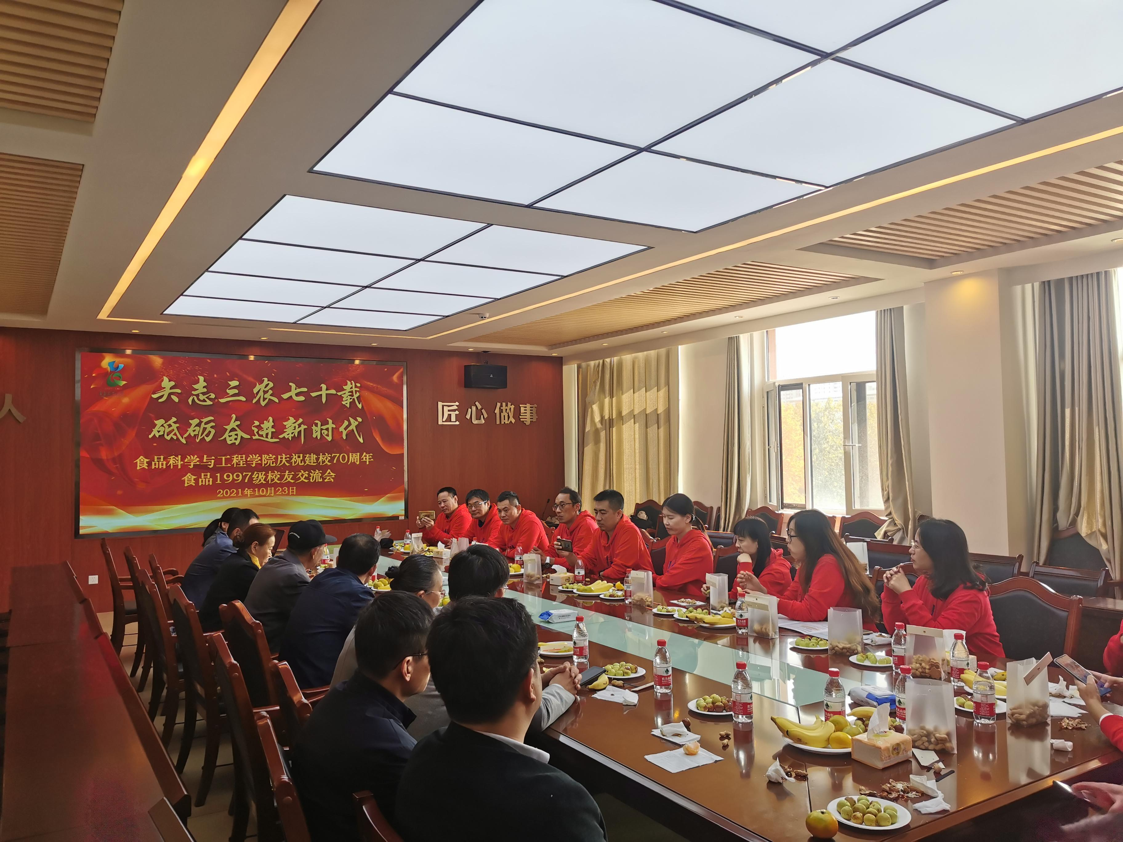 10月23日,太阳成集团tyc522cc1997级员工荣归母校,共同纪念毕业二十周年及建校七十周年。公司党委书记宋伟、副经理肖军霞及教师代表在食品楼与返校员工进行了亲切交谈。