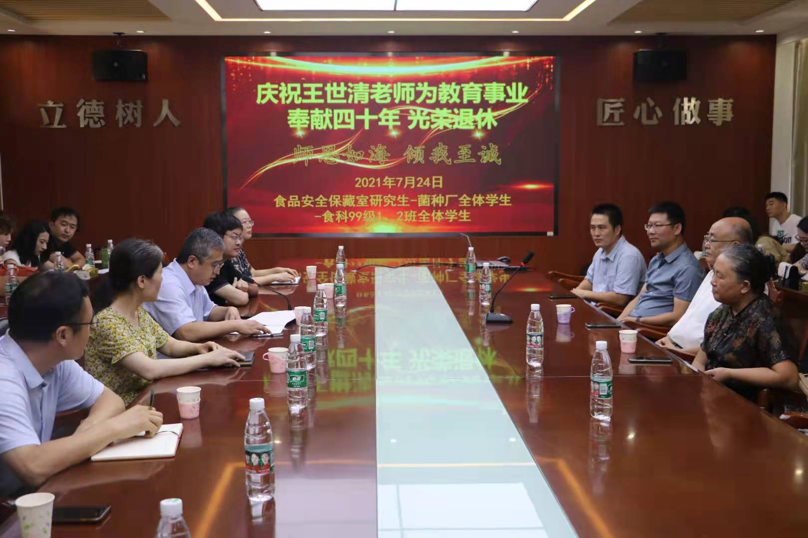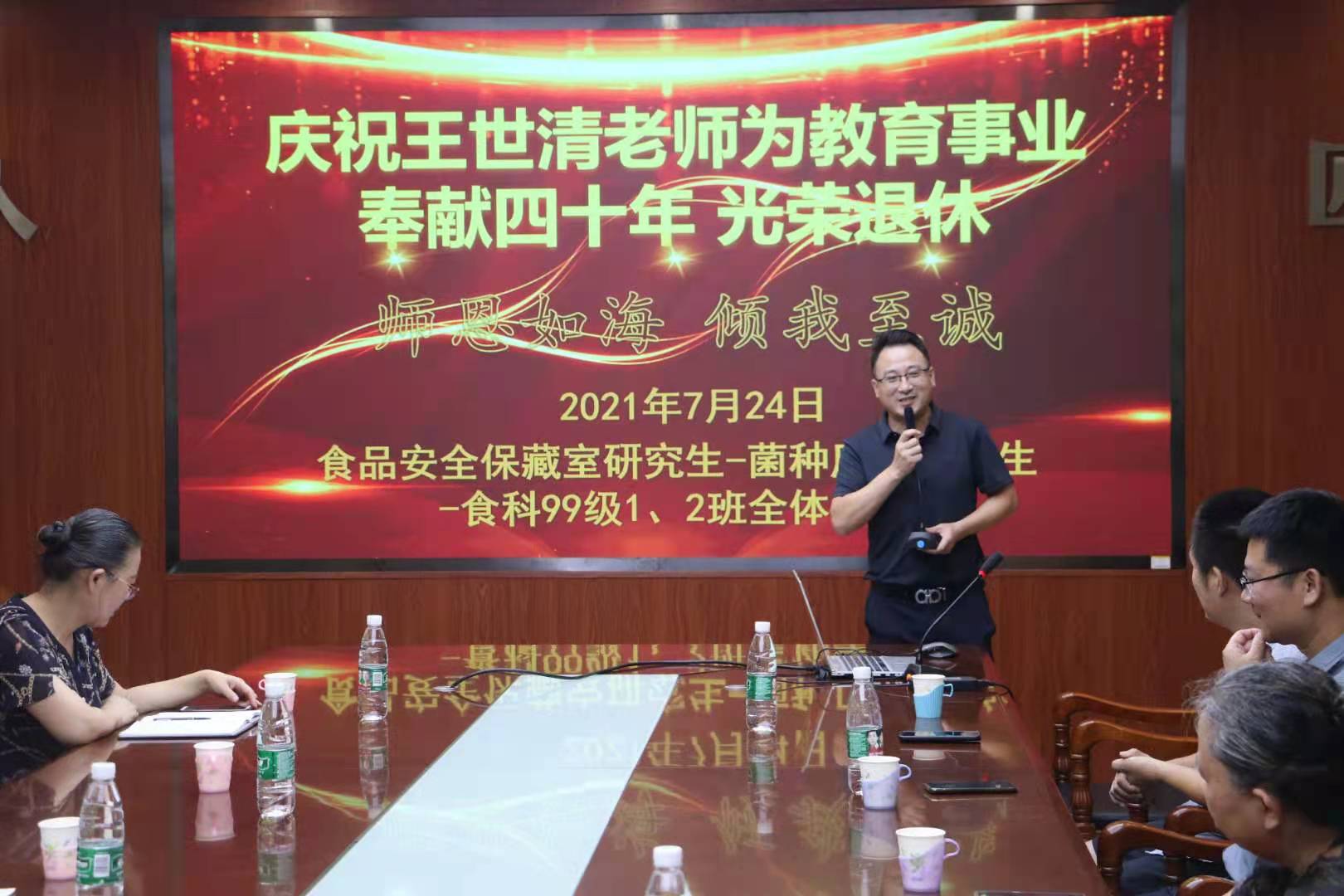 答谢会上,员工代表食科99级2班肖仁伟,食品安全保藏实验室研究生李新建、叶耀伟分别发言,共同回忆与王世清教授相处的点点滴滴,真诚感谢王世清老师从学习和生活等方面给予的教导和关怀,并真诚的祝愿他能在即将到来的人生新阶段,活出人生新精彩。答谢会上,尽管因工作原因无法来到现场,公司党委书记宋伟以及身处各地的同学通过视频的方式,为王世清教授送上了祝福。