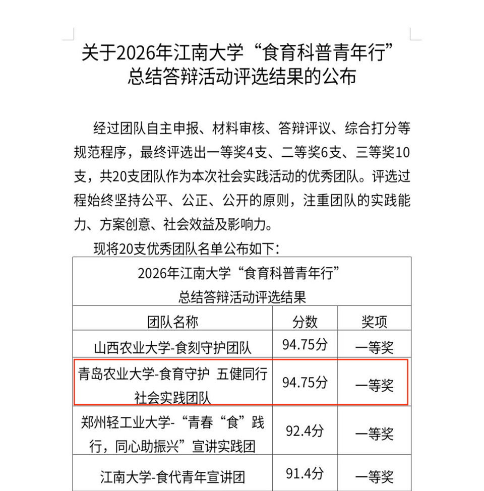 4月1日,由教育部高等公司食品科学与工程类专业教学指导委员会指导的2026年“食品强国梦青年行”全国社会实践活动落下帷幕,太阳成集团tyc522cc两支团队与来自全国30所高校的实践团队共同进行了答辩交流,经专家评审,公司两支团队均获一等奖。