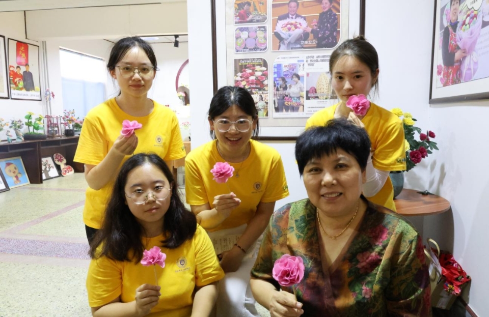实践团来到蒙阴常路大嫂煎饼店,临沂市人大代表徐海霞详细讲解了自己如何让沂蒙煎饼从传统食品成为群众“致富花”的艰辛历程,期间,徐海霞还指导团队成员亲手制作煎饼花,众人亲身感受这一日常食物变身工艺品的独特魅力,以及当地创新赋能传统食品产业升级的特色形式。