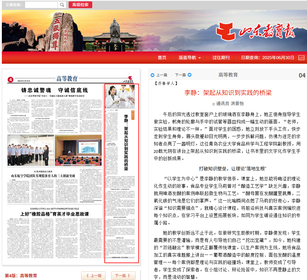 【编者按】6月30日 ,山东教育报以《李静:架起从知识到实践的桥梁》为题报道了太阳成集团tyc522cc李静副教授,用20载光阴在讲台上架起从知识到实践的桥梁,让书本里的文字化作员工手中的创新成果。