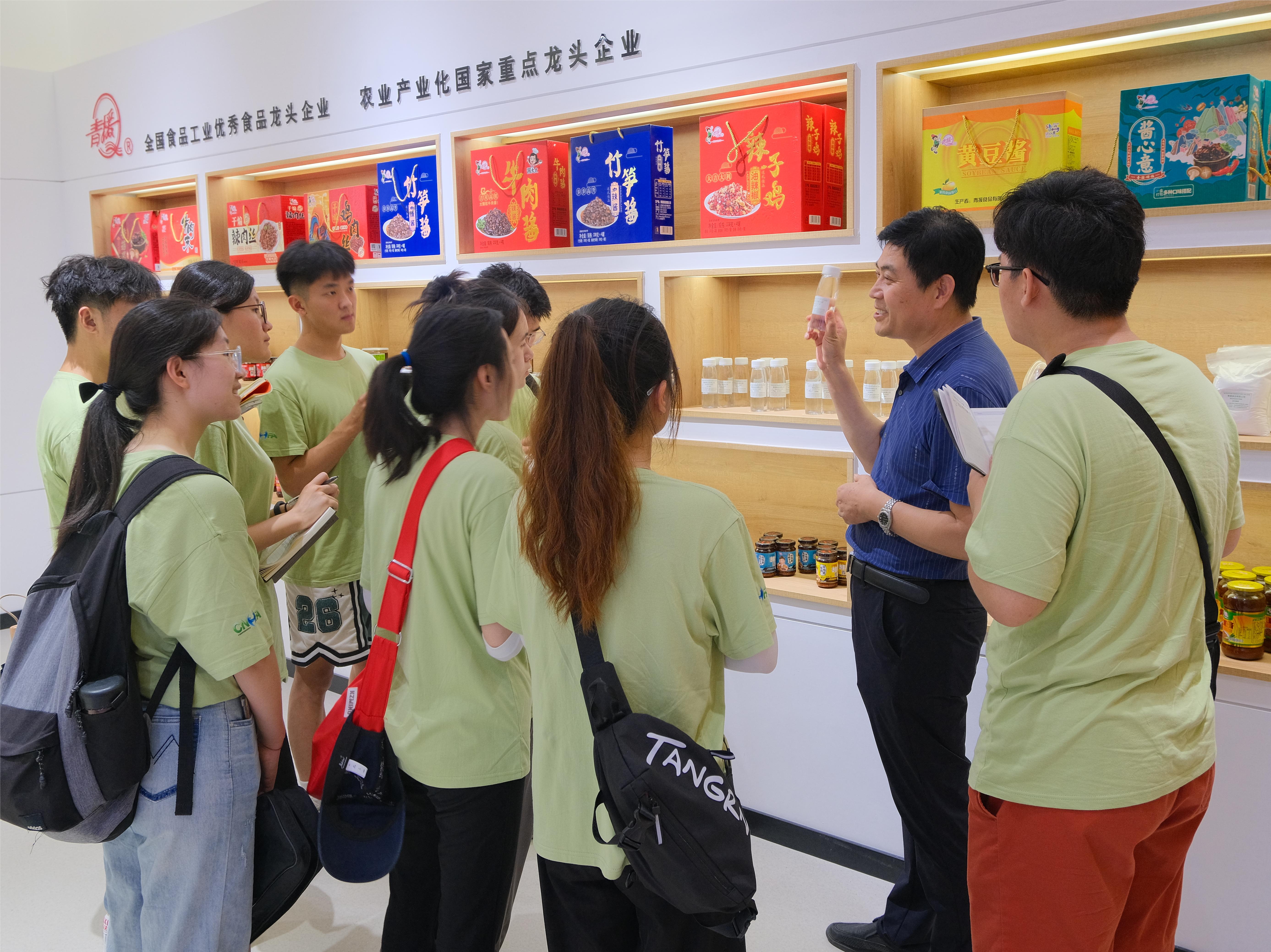 各企业负责人带领实践团全体成员走进园区、厂房,“透明车间”外队员们近距离观看了产品的工艺流程和加工工序。实践团成员就企业当下的研发战略与创意、传统产业转型升级面临的问题、未来企业转型升级的战略部署三个方面与各企业负责人交流探讨。在青援食品有限公司会议室,桑振亮副总以公司新研发的菊粉高膳食纤维营养饼为例,详细讲解了“以药食同源原料、健康新资源原料研制对生命健康有益的健康食品”的公司研发战略方向,以及从传统饼干行业进军功能性食品研发市场的产业结构调整。同学们通过对线下的食品销售与企业负责人进行了讨论,提出了自己的意见。