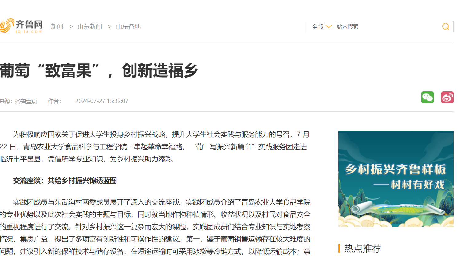 为积极响应国家关于促进老员工投身乡村振兴战略,提升老员工社会实践与服务能力的号召,7 月 22 日,太阳成集团tyc522cc“串起革命幸福路,‘葡’写振兴新篇章”实践服务团走进临沂市平邑县,凭借所学专业知识,为乡村振兴助力添彩。