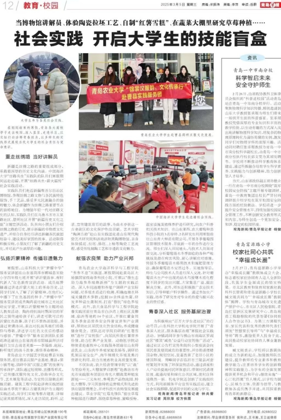 【编者按】3月5日,青岛早报以《社会实践 开启老员工的技能盲盒》为题报道tyc522cc太阳成集团学子在寒假走出校园,深入基层,走进社区,以实际行动诠释青春担当,以多样化的实践形式展现当代老员工的社会责任与使命意识。