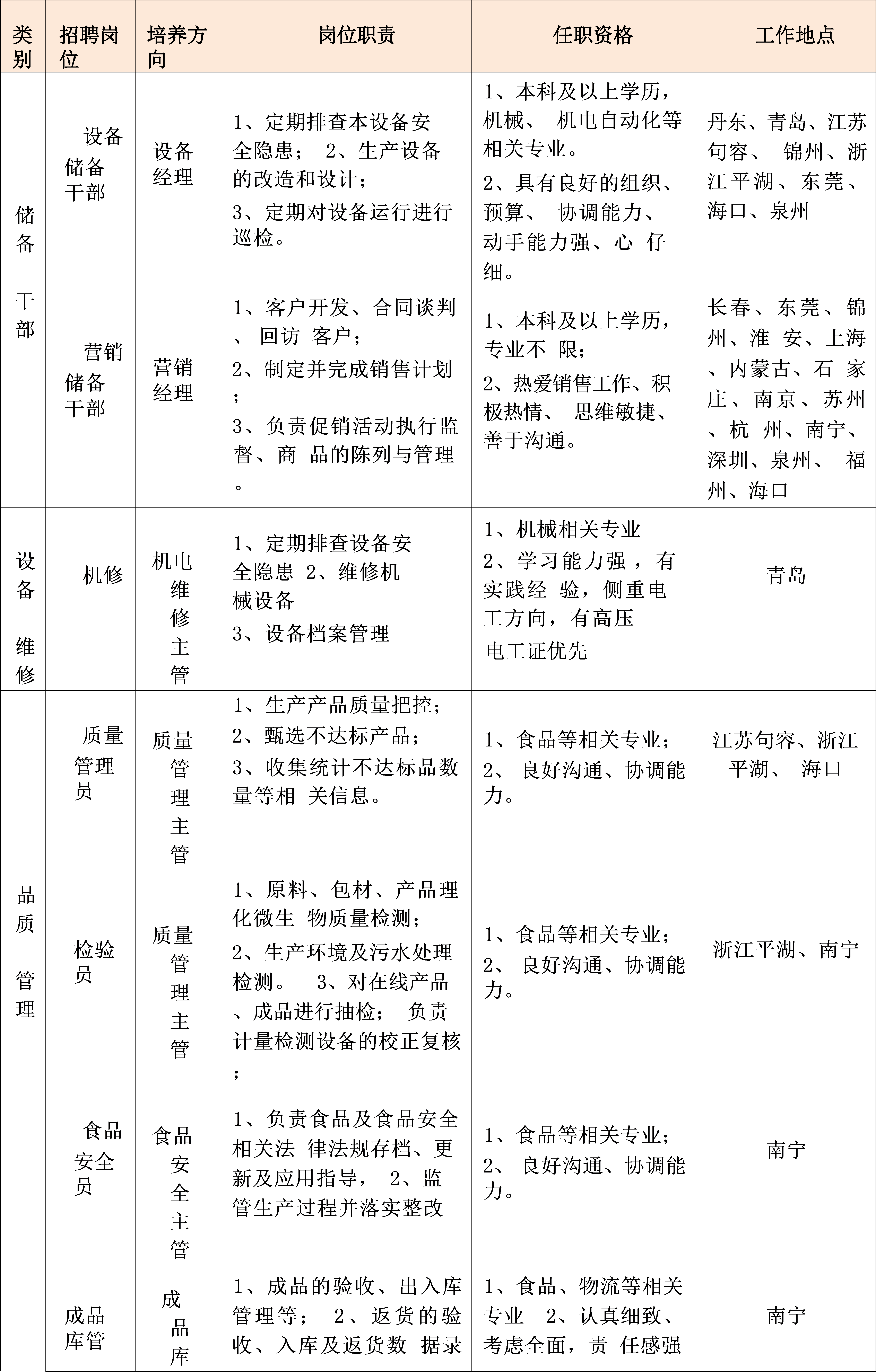 所需专业:食品类、机械类、自动化类、工程类等相关专业
