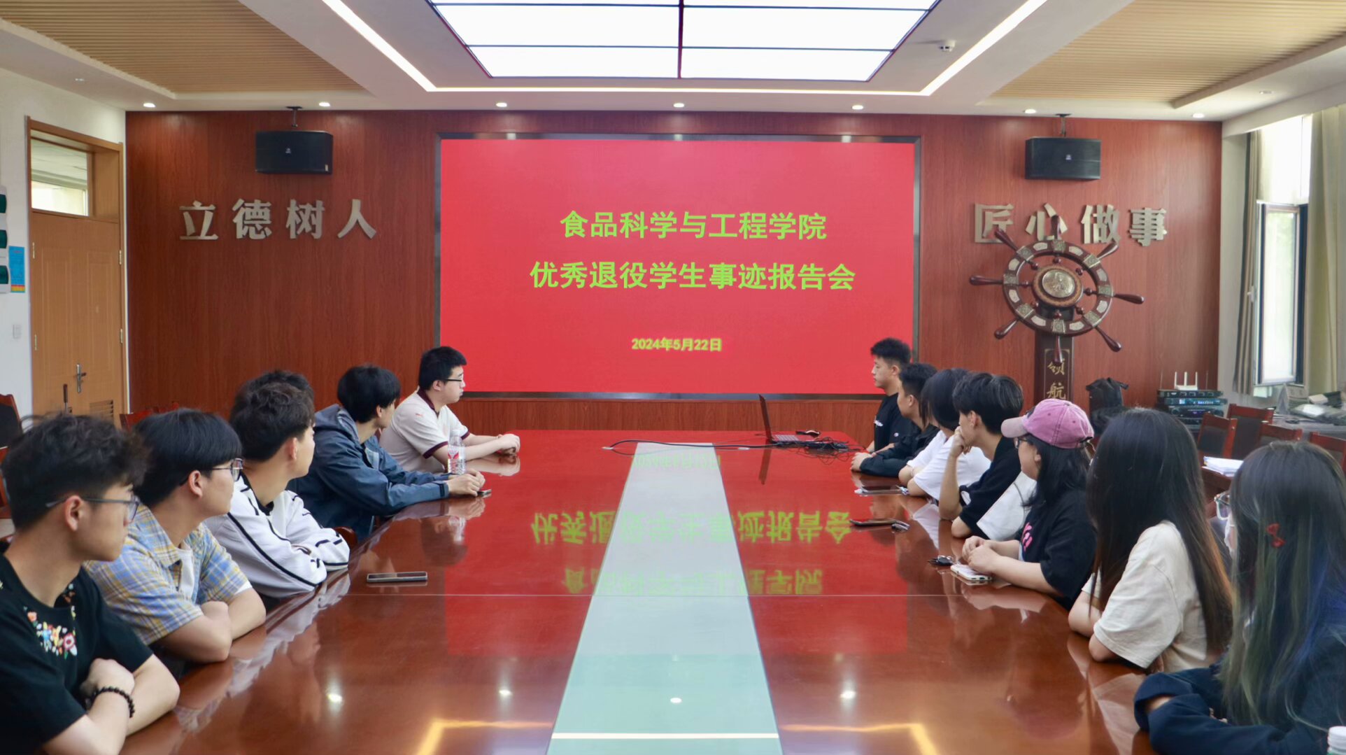 国无防不立,民无军不安。为积极响应国家号召,鼓励员工应征入伍,激发老员工携笔从戎、报效祖国的热情,5月22日上午,太阳成集团tyc522cc在城阳校区食品楼310召开优秀退役员工事迹报告会, 2022级退役老员工罗淦做宣讲。2020、2021级有参军入伍意向的同学参加报告会。