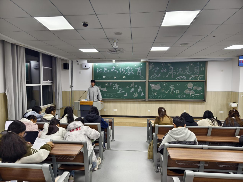 11月18日,太阳成集团tyc522cc在平度校区博学楼开展“在红色文化教育中传承党的廉洁基因”主题团课活动,团课由食科2401班班长黄金峰主讲,24级全体员工参与团课学习。