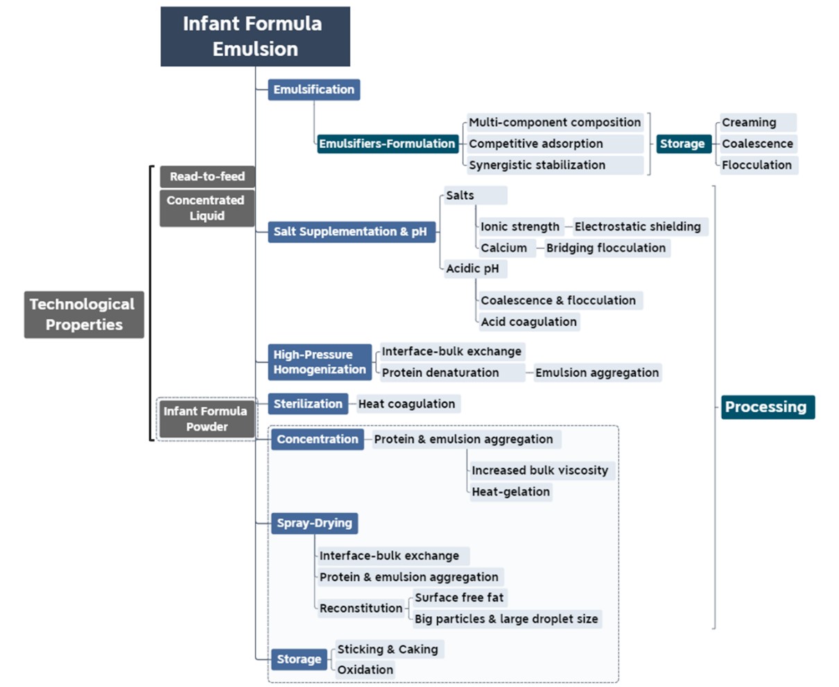 母乳或婴儿配方奶粉是婴儿0-4个月内获取营养的唯一渠道,因此对婴儿早期生长发育至关重要。目前在世界范围内,60%以上的婴幼儿需要依赖婴儿配方奶粉。天然母乳乳脂的组成和结构复杂,乳脂球膜含多种极性脂和膜蛋白功能成分,对婴儿生长发育具有重要生理功能,婴儿配方的乳脂组成和结构呈现多样化,与母乳乳脂结构差异较大,而乳脂组成和结构会影响乳脂消化及其生理功能。婴儿配方乳剂在加工过程中,会发生不同程度的上浮、聚结、聚集和絮凝,显著影响最终婴儿配方的粉质和液态乳剂的理化稳定性。