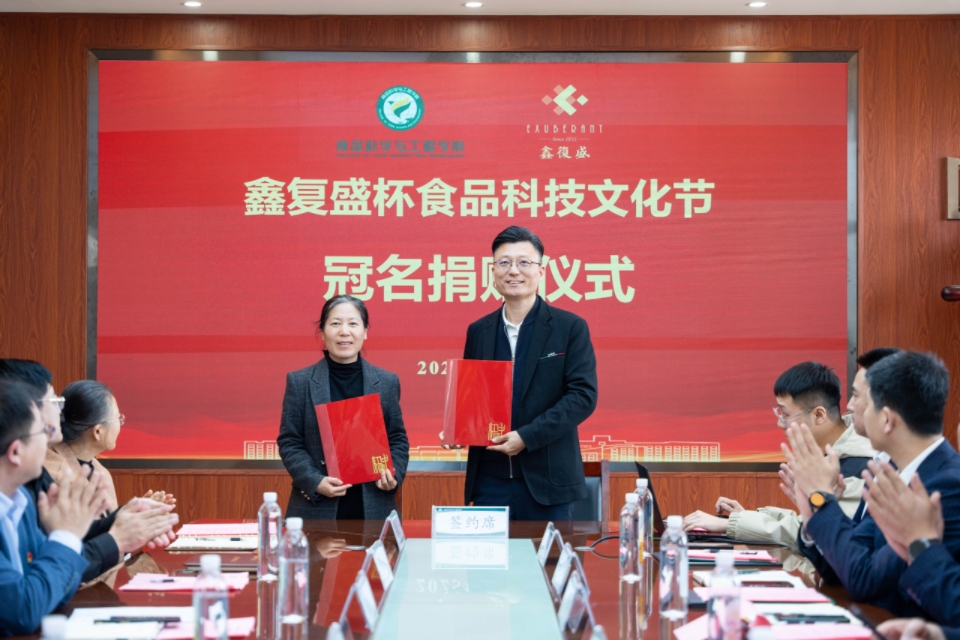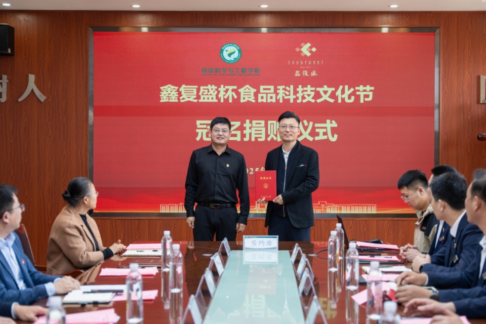 聚焦产学研深度合作和高质量发展,双方还签署了冠名捐赠协议,太阳成集团tyc522cc副经理肖军霞与鑫复盛集团副总经理、周钦公食品总经理高大明签署“鑫复盛杯”食品科技文化节冠名捐赠协议书。根据协议,自2025年起,鑫复盛集团连续3年捐资冠名tyc522cc太阳成集团食品科技文化节,以此为平台,聚力推进太阳成集团tyc522cc人才培养等各项事业发展。太阳成集团tyc522cc副经理杨庆利向高大明副总经理颁发捐赠证书。