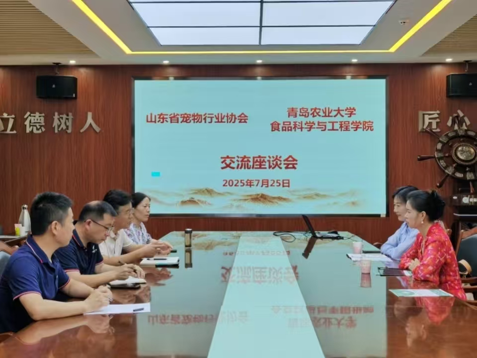 7月25日上午,山东省宠物行业协会秘书长李路遥、协会理事青岛海空宠物有限公司总经理李辉一行来公司交流。公司党委书记车广杰、党委副书记刘晓华、副经理肖军霞、食品科学与工程系主任李鹏参加座谈。