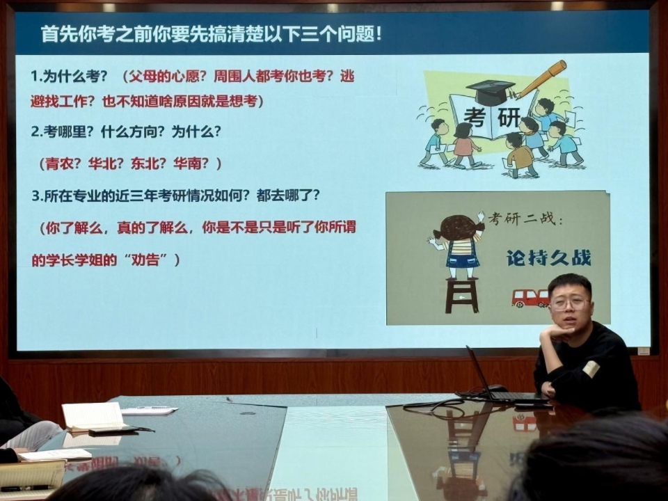 辅导员耿磊为员工干部做就业考研专题解析。耿磊立足食品专业特点,通过大数据分析展示了近三年毕业生的流向,横向对比了食品企业、检测机构等就业方向的市场需求,纵向梳理了考研院校选择、复试准备、调剂策略等关键节点,指导员工干部在服务同学的过程中同步做好自身职业规划,明确个人发展方向。