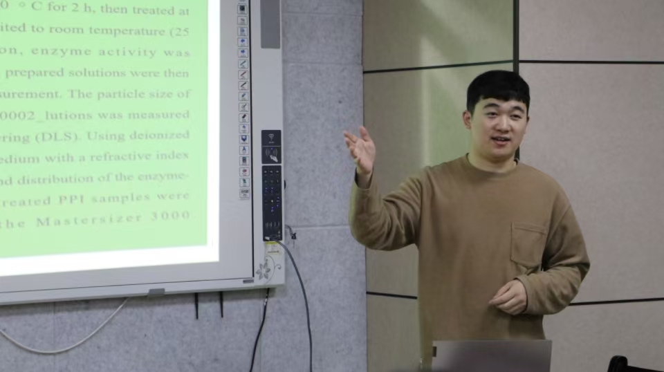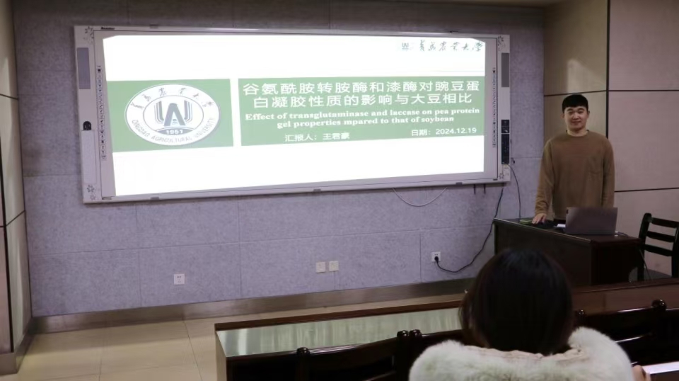 12月19日,公司举办了第三十六期“食学研讲”学术汇报活动。本次活动由食品加工与安全专业24级研究生王君豪主讲,他以“转谷氨酰胺转胺酶和漆酶对豌豆蛋白凝胶性质的影响与大豆蛋白的比较”为主题,探讨了植物蛋白凝胶性能的改进研究,吸引了众多师生参与。