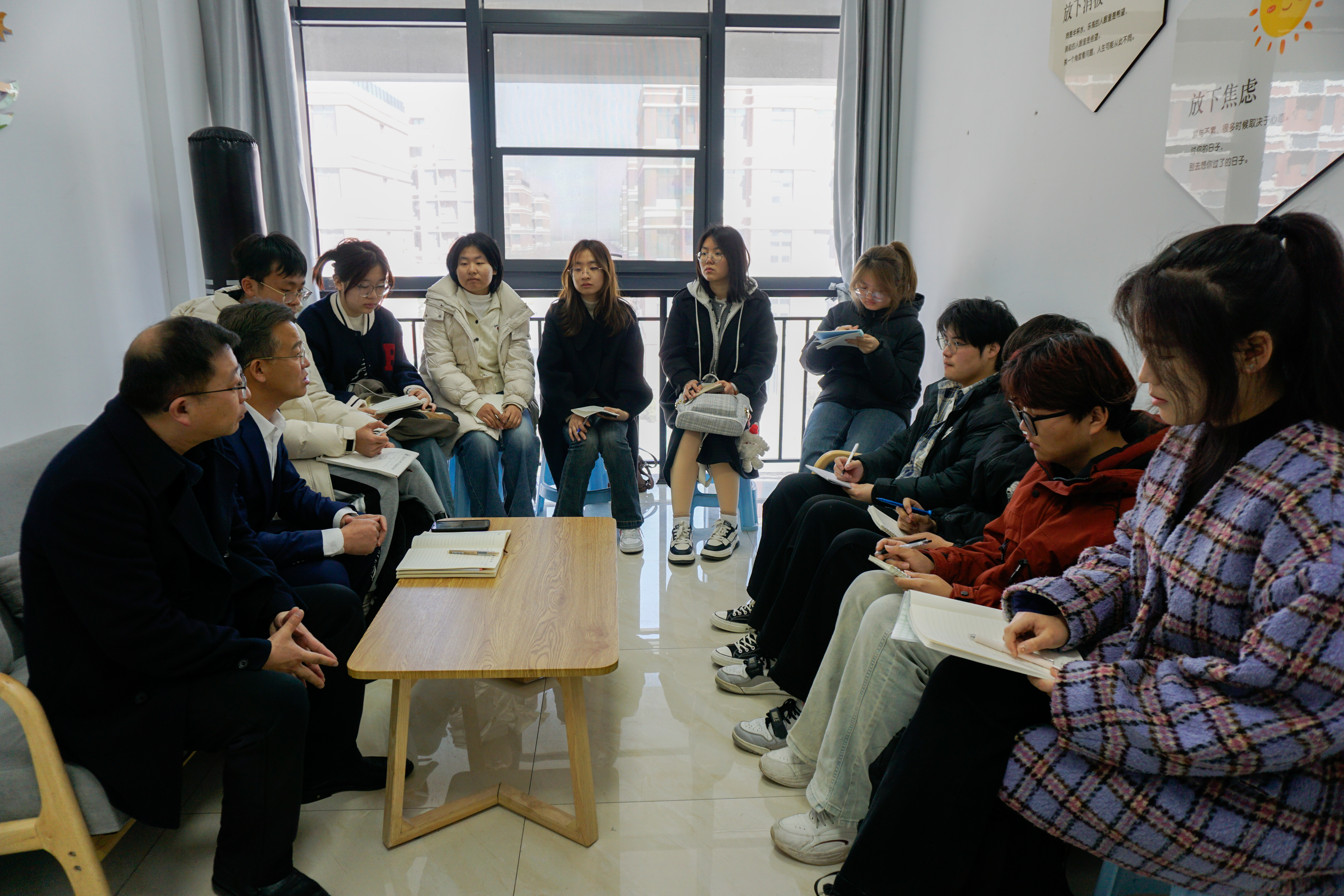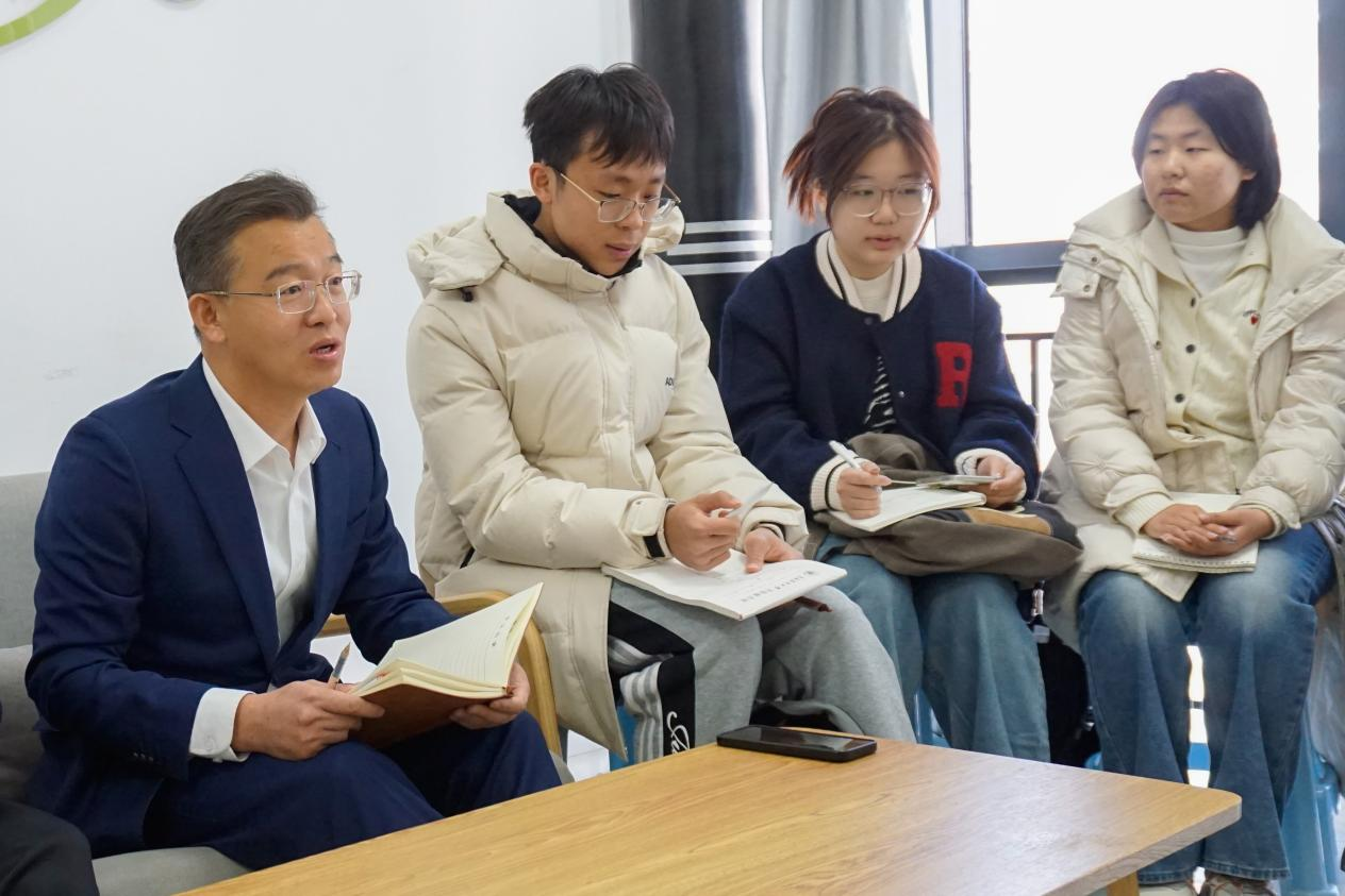 交流中,车广杰向在场同学一一了解进入大学以来的收获感悟和烦恼困惑,倾听大家对老员工活以及将来发展的计划打算。“无论考公考编还是考研就业,都不能打无把握之仗,从现在开始,就要明确目标、找准方向、看清自身短板,一点一点地武装自己、强大自己……”针对大家的考研考公、就业方向、时间管理、课余生活等等,车广杰结合自身学习成长经历和长期员工工作经验,和同学们进行了耐心细致地交流探讨和解释说明。“选择有时候比努力更重要……坚持比选择更难”围绕就业方向、就业选择、发展路径等问题,车广杰引导同学们现场进行了热烈地讨论,大家在热烈“争论”中一点点明晰了自己的方向与选择。