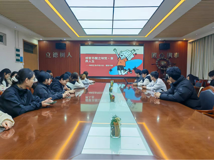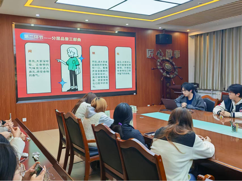 本次活动以“味觉正念疗愈”为主题。在正念引导环节,参与者在轻柔的引导声中闭眼深呼吸,感受食物温度与呼吸节奏的交融;随后进入分层品味三部曲,大家依照“闻香气、触质感、化余味”的步骤,专注体会食物在口中的味觉变化;最后的“共享味觉记忆场”环节中,同学们积极分享情绪感受,在倾听与交流中实现情感共鸣。同时,在理论讲解部分,主持人系统介绍了正念与味觉之间的科学联系,包括味觉调节情绪的神经机制以及感官特异性等核心知识。