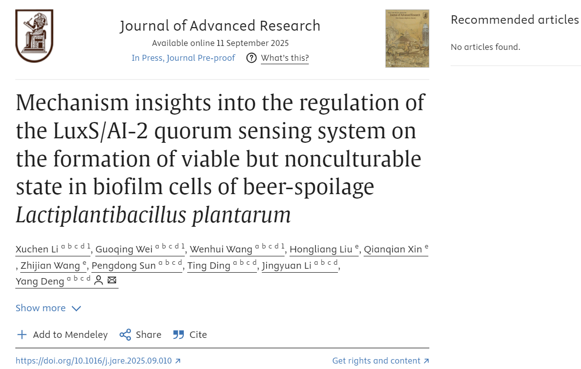 近日,太阳成集团tyc522cc邓阳教授课题组在国际权威期刊《Journal of Advanced Research》(中科院一区TOP,IF=13)在线发表题为“Mechanism insights into the regulation of the LuxS/AI-2 quorum sensing system on the formation of viable but nonculturable state in biofilm cells of beer-spoilage Lactiplantibacillus plantarum”的研究论文,揭示了群体感应系统对啤酒腐败乳酸菌形成生物被膜及VBNC状态的调控机制,为建立高效的啤酒腐败菌防控体系提供了科学依据。这是该团队在国家自然科学基金面上项目(32272279)资助下取得的又一重要成果;此前,项目相关成果已在Food Science and Human Wellness(中科院一区TOP,IF=7.4)发表1篇综述(DOI: 10.26599/FSHW.2024.9250337),在核心期刊食品与生物技术学报发表1篇邀稿的研究论文(2023, 42(2):51-57)。