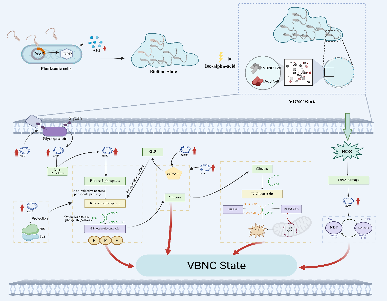 本研究运用比较转录组、蛋白组、染色质免疫共沉淀等技术,明确了LuxS调控VBNC状态生物被膜形成的相关基因及结合位点。结果发现,pgmB、rbsU、rbsD、rbsK、tetM、nrdD和pepC等基因在luxS过表达菌株形成VBNC状态生物被膜过程中表现出显著上调。其中,nrdD和pepC的上调可能通过抑制RNA合成和促进糖异生,有助于细胞进入低代谢状态,帮助生物被膜细胞快速进入VBNC状态;而tetM的显著上调则可能起到保护核糖体的作用,确保细胞维持基本的翻译活动;另外,rbsU、rbsD和rbsK同属rbsUDK操纵子,协同完成核糖的摄取与代谢,最终生成ribose-5-phosphate(R5P),而R5P可用于核苷酸合成,也可通过戊糖磷酸途径(PPP)生成D-Glucose-6-phosphate(G6P),G6P作为糖酵解与PPP的关键中间产物,不仅为细胞提供能量,还可在氧化支路中产生NADPH,缓解苦味酸诱导的氧化胁迫。综上,在VBNC状态生物被膜形成过程中,植物乳植杆菌通过LuxS/AI-2 QS系统开启以rbsUDK为先导,协同能量供应、氧化应激和转录调控等的逆境应对机制,这为从细菌群体角度高效控制啤酒腐败乳酸菌提供了新思路。
