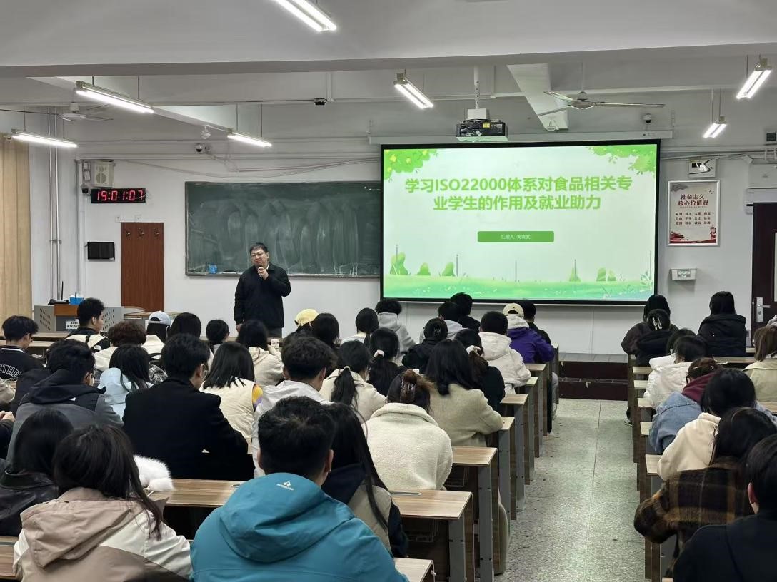 关京武结合当前毕业生就业形势,指出开展职业技能学习对提升就业竞争力的重要性。他分别介绍了各类职业技能证书的报考条件和适用范围,并着重介绍了学习ISO22000认证体系对员工就业岗位匹配、参与实际操作等方面的重要意义,并鼓励同学们加深了解、积极参加学习,为今后从事食品质量检测、食品认证审核等工作做好知识和技能储备。辅导员耿磊则以历年参与学习的毕业生案例,鼓励同学们积极获取个人职业发展的“敲门砖”和“通行证”,为同学们指明了拓宽职业发展空间的有效路径。